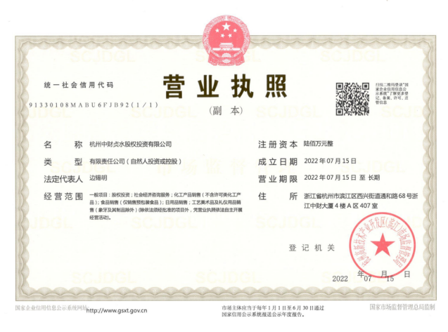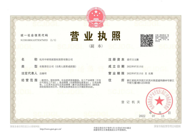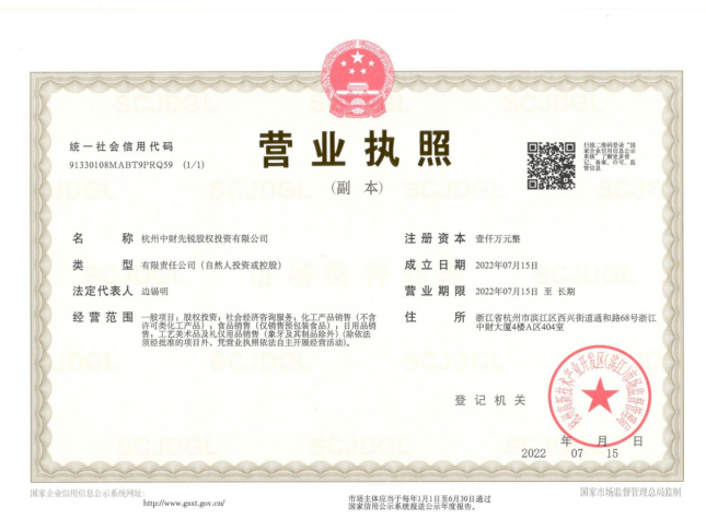 中财讯 根据中财董局字[Ⅷ]第6号之文件精神,为进一步壮大中财投资事业,全面构建中财投资十一条大街,在集团首席投资官、集团常务副总裁、集团执行总裁(资本)的组织筹建及各级领导的通力支持下,杭州中财先锐股权投资有限公司、杭州中财龙场股权投资有限公司、杭州中财悟派股权投资有限公司、杭州中财贞水股权投资有限公司、杭州中财雪蓥股权投资有限公司、杭州中财海如股权投资有限公司等六家公司已于2022年7月15日领取营业执照,正式成立。
