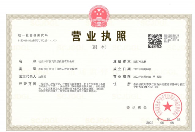 中财讯 根据中财董局字[Ⅷ]第6号之文件精神,为进一步壮大中财投资事业,全面构建中财投资十一条大街,在集团首席投资官、集团常务副总裁、集团执行总裁(资本)的组织筹建及各级领导的通力支持下,杭州中财启真股权投资有限公司、杭州中财俊飞股权投资有限公司,已于2022年8月8日领取营业执照,正式成立。