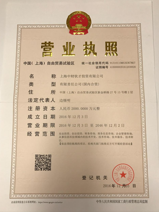 中财讯 根据中财董局字【VI】第43号文件《关于组件中财集团印度分部暨独资建厂等问题的原则意见》,经过各方面领导的支持,在相关部门的通力配合下,中国(上海)自由贸易试验区市场监督管理局于12月初正式颁发上海中财钦才投资有限公司营业执照,意味着中财投资村落进一步壮大。
